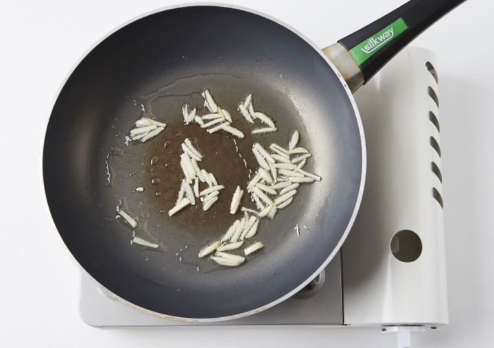 フライパンを中火に熱しサラダ油(大さじ1)をひいた後、ニンニクを入れて香りが出るまで炒める。