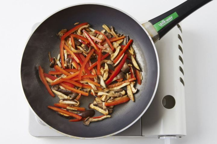 ヒラタケ、椎茸、パプリカを入れて炒めながら塩(少し)、胡椒(少し)、醤油(大さじ1)を入れていく。