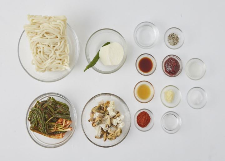 ネギキムチ(100g)、タマネギ(½個)、盛り合わせシーフード(100g)、うどん(300g)、青陽唐辛子(1個)、鰹節(握り)