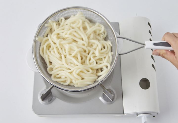 うどんは、お湯に軽く浸し麺を湯がいたあと、水をよくきる。