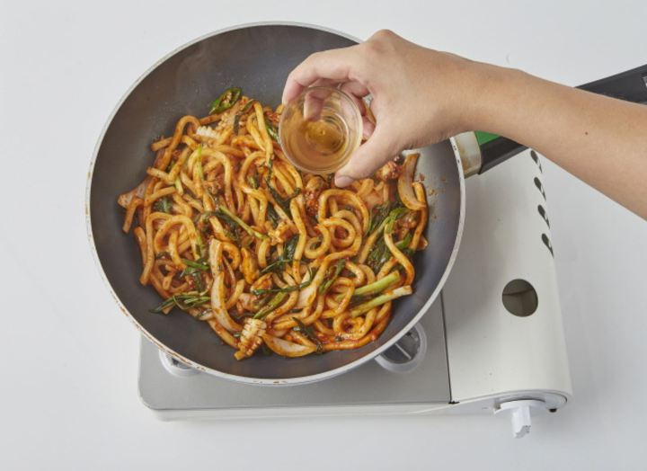 シーフードとネギキムチ、青陽唐辛子、たれを入れて2分間炒め、うどんとごま油を入れて箸でかき混ぜながら炒める。
