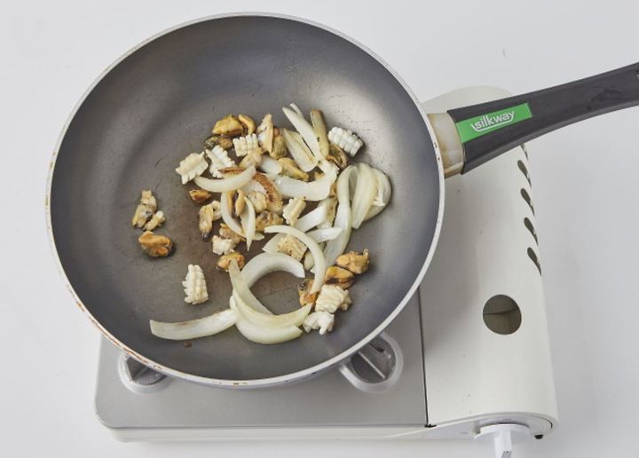 中火熱し鍋にサラダ油(大さじ1)をひき、強い火でタマネギ、海鮮を炒める。